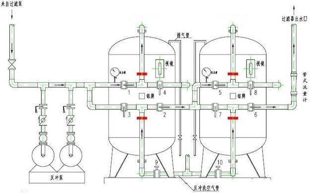 10、當運行一個周期時要對濾料進行反沖洗或水質(zhì)發(fā)生變化時應進行清洗濾料, 其方法按照操作規(guī)程進行,沖洗完畢化驗其水質(zhì)合格后,再投入運行。